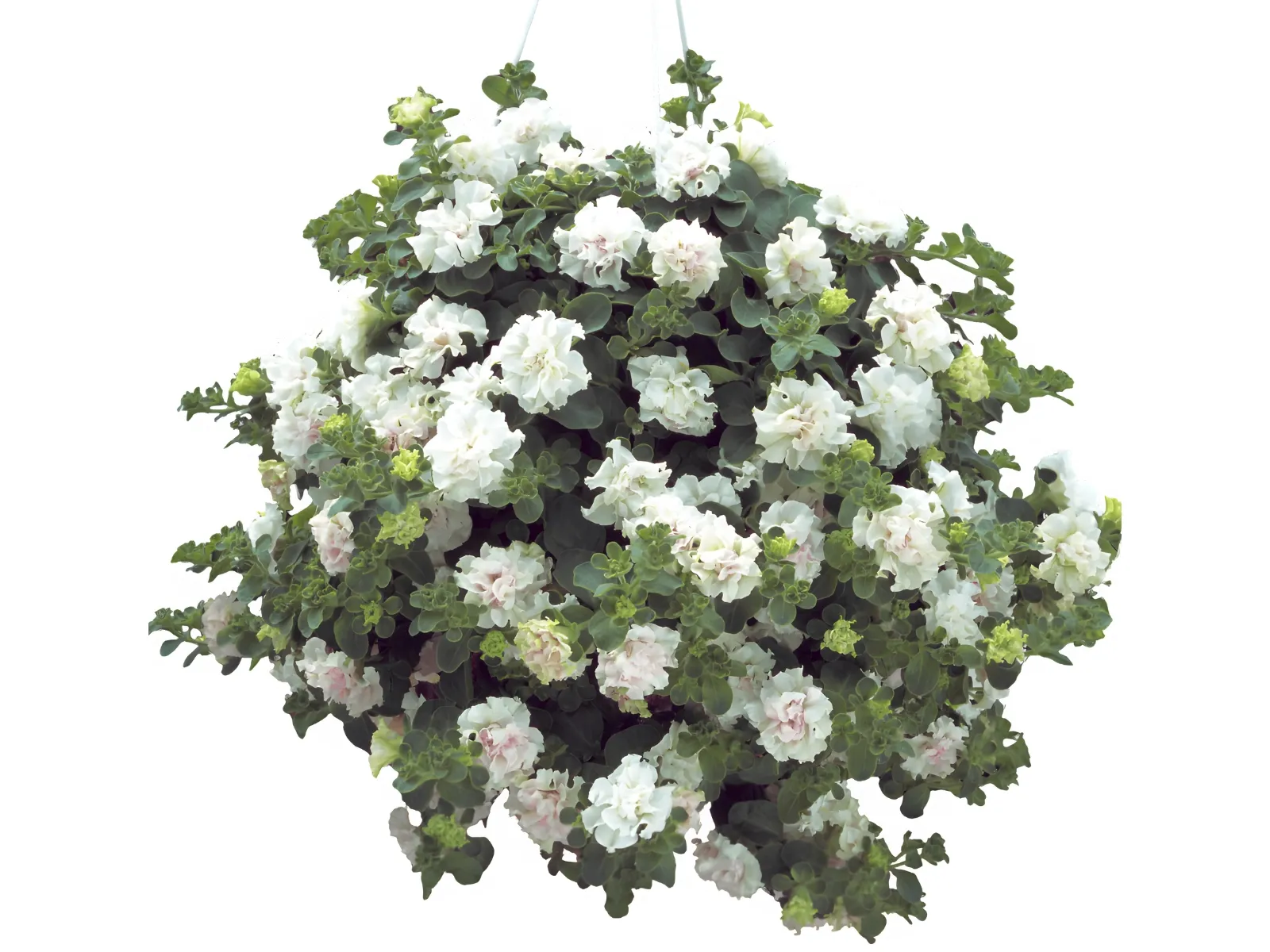 Surfinia Double White (Petunia x atkinsiana 'Double White’) to niezwykle efektowna roślina jednoroczna o silnym, kaskadowym pokroju. Tworzy długie, wiotkie pędy, które mogą osiągać nawet do 1 metra długości, tworząc gęste, kwiatowe zasłony. Największym atutem tej odmiany są jej kwiaty – są one pełne, podwójne, o pofalowanych płatkach i wyjątkowej, śnieżnobiałej barwie. Kwitnienie jest nieprzerwane i bardzo obfite, trwa od maja aż do pierwszych jesiennych przymrozków, tworząc spektakularną dekorację.