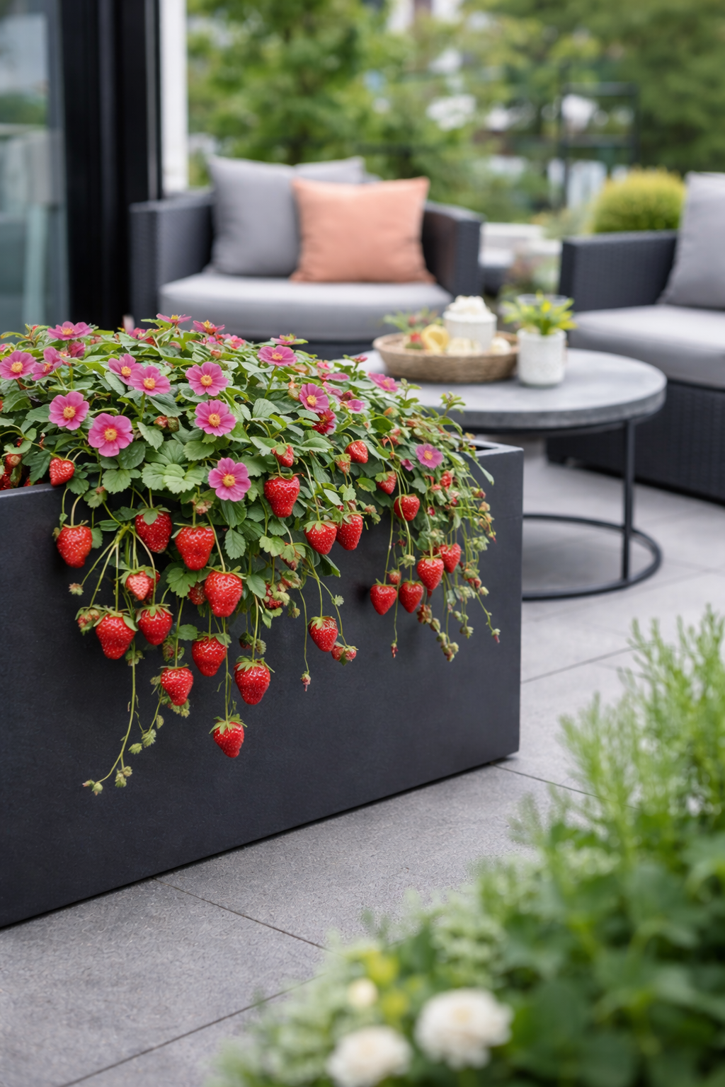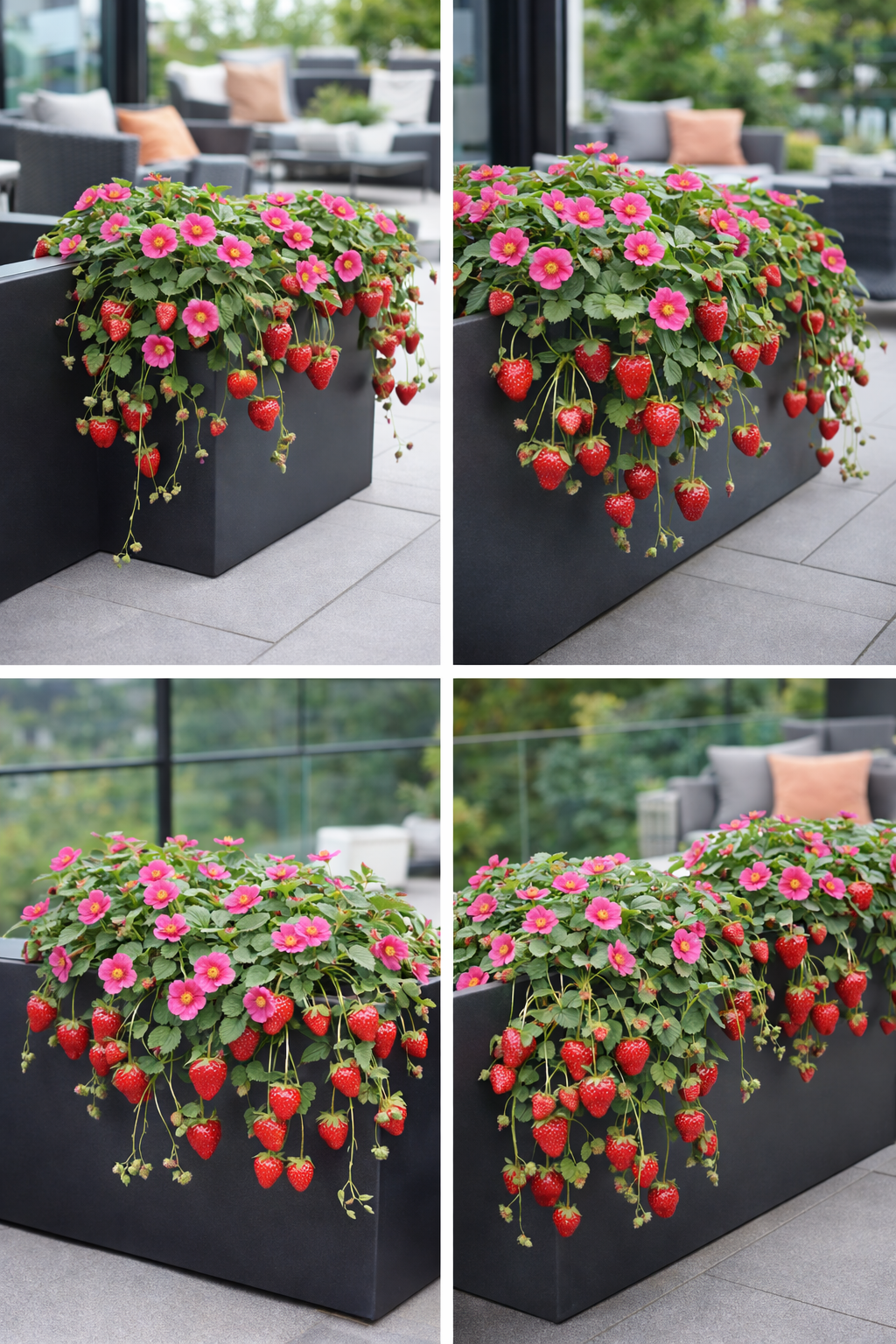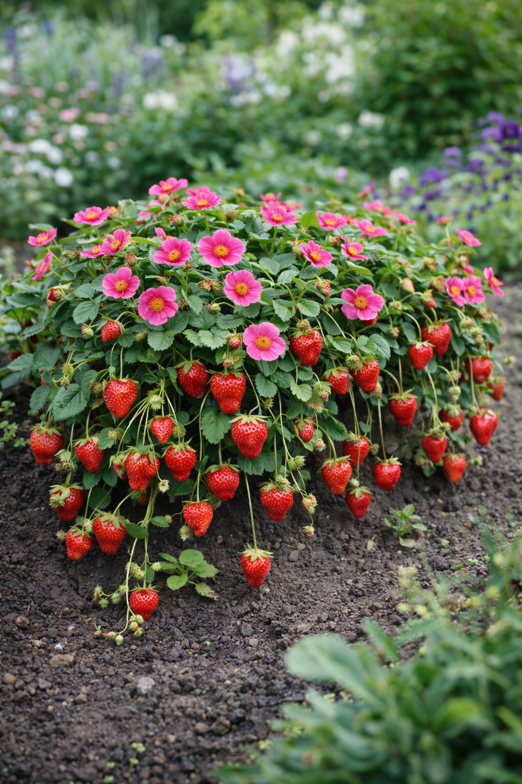 Truskawka Toscana to niezwykła odmiana, która zachwyca dwukolorowym efektem dekoracyjno-owocowym. Już od wczesnej wiosny pojawiają się na niej intensywnie różowe kwiaty, które wyglądają jak małe ozdobne pąki kwiatów balkonowych. Tuż obok nich stopniowo dojrzewają soczyste, czerwone truskawki – słodkie, pachnące i idealne do podjadania prosto z krzaczka.